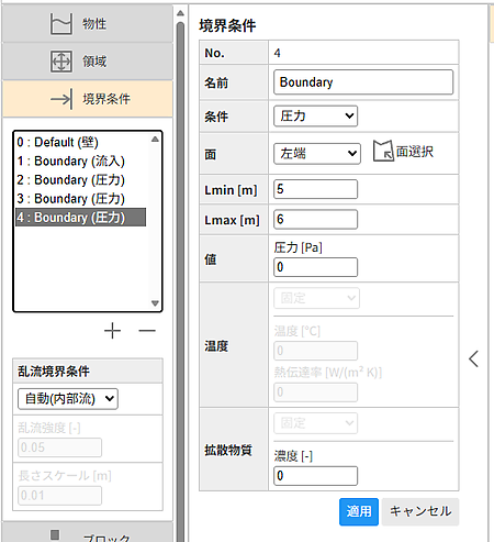No.4に左上の部屋の窓を設定します。条件は「圧力」、面は「左端」、Lminは「5」、Lmaxは「6」、値(圧力)は「0」Pa、濃度は「0」を入力します。入力したら[適用]ボタンを押して、境界表示を確認します。